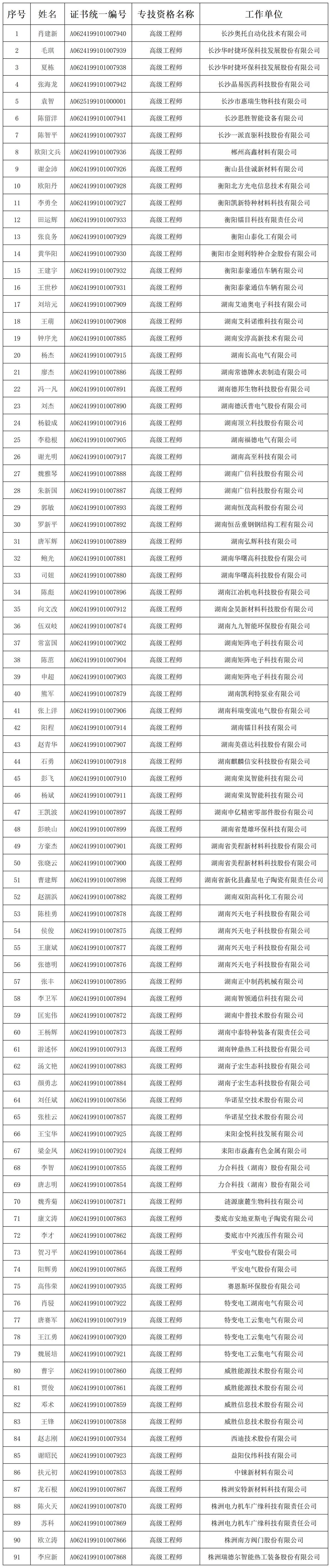 发表时间:2025-08-25 14:15网址:https://www.hnjxjy.com 各有关单位职称改革工作领导小组: 2025年4月26日,省工程和经济系列职改办组织开展专精特新中小企业高级职称专场评审。经专精特新中小企业高级职称专场高级职称评审委员会评审通过,并报省职称改革工作领导小组备案(湘人社职称〔2025〕232号),现确认肖建新等91名同志具备工程系列高级专业技术职称(具体名单见附件),职称确认时间为2025年5月6日。备案结果在“湖南省人力资源和社会保障厅门户网站-办事大厅-热门服务-湖南省高级职称证书查询”提供公共查询。本人可通过“智慧人社”APP查询并打印高级职称电子证书。 特此通知。